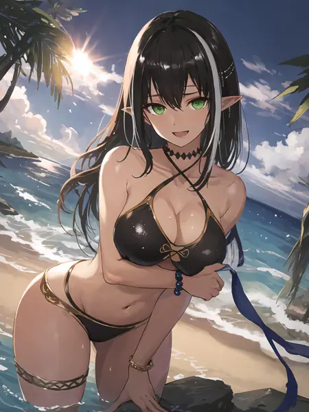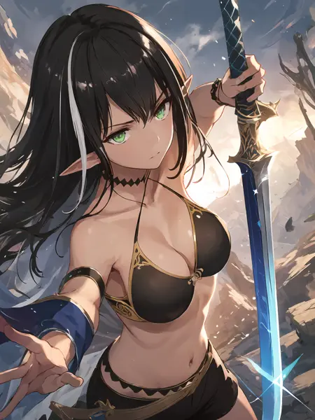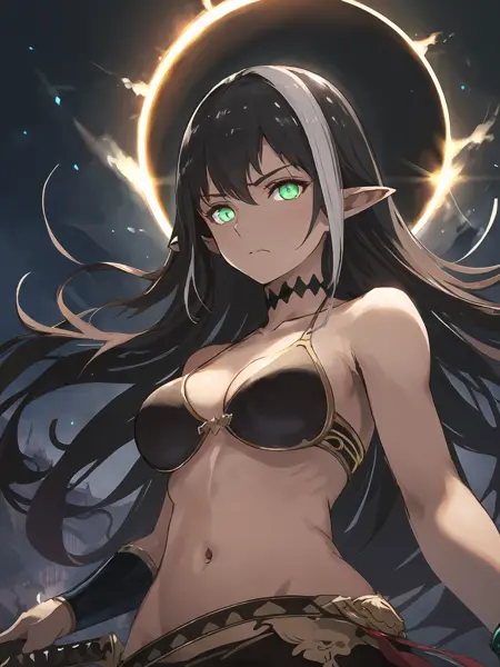 Basic characteristic : Black hair,long hair / ponytail ,two-tone hair,green eyes,pointy ears,earrings ;