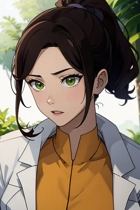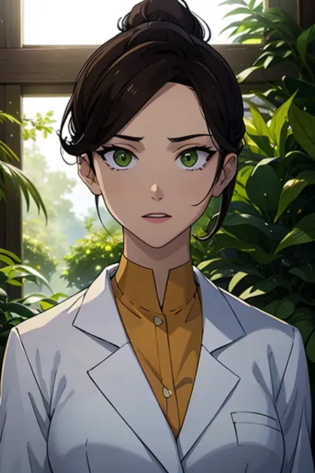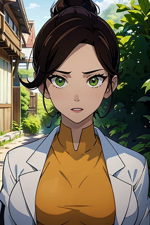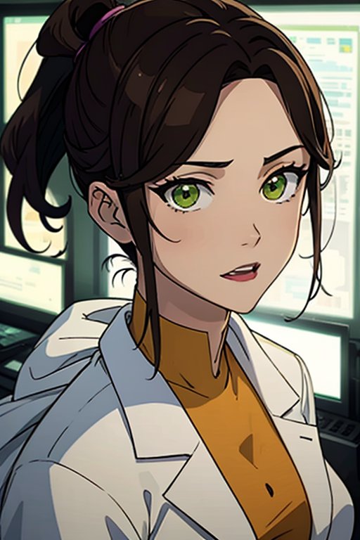 prompt: A stunning and intricate full color portrait, a 28 year old girl, long brown hair, ponytail in her hair, green eyes, detailed face, wearing a white doctor's coat, under a yellow shirt, epic character composition, alessio albi, nina masic, sharp focus, natural lighting, subsurface dispersion, f2, 35mm
