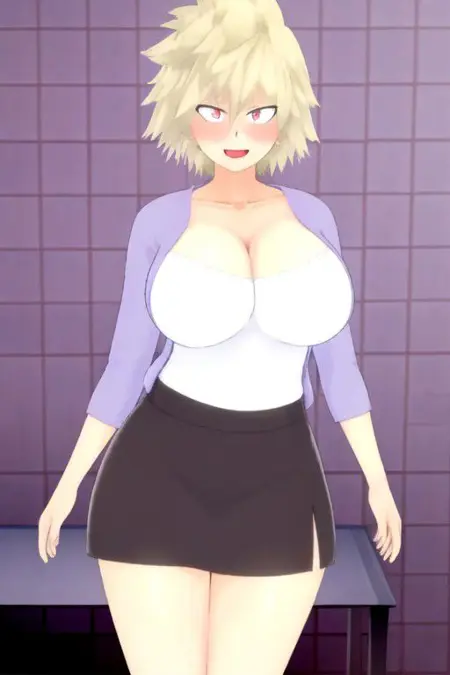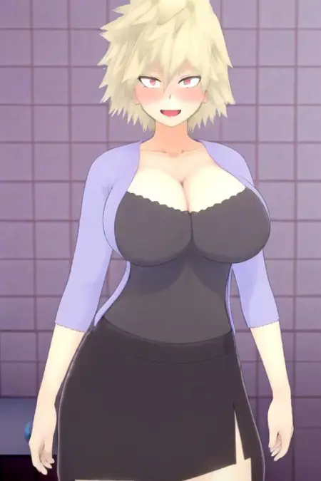 Mitsuki is a woman with spiky ash-blonde hair and red eyes; the same aforementioned traits that her son Katsuki inherited. Because of her Quirk, she maintains a youthful appearance despite being in her late thirties. At home, she is seen wearing a white blouse underneath a lavender cardigan with a short black skirt