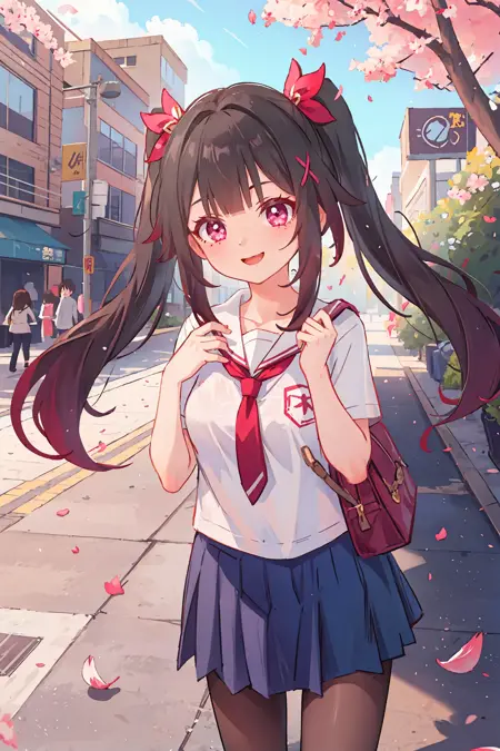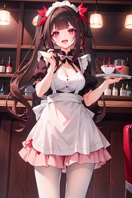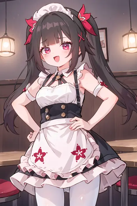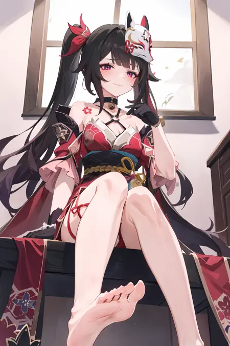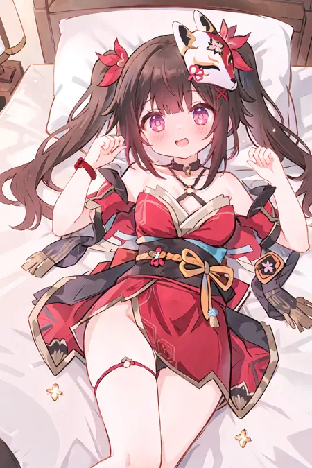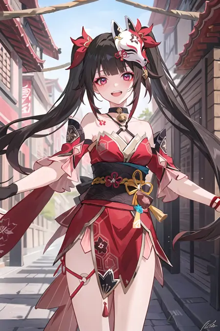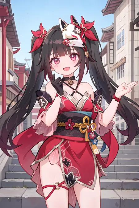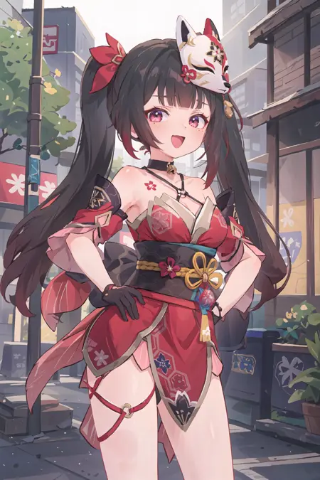 Additional prompts for default costume: twintails, red hair ribbon, criss-cross halter, off shoulder kimono, mask on head, detached furisode sleeves, bell choker, obi, black single glove, wrist ribbon, nail polish, thigh strap, cross-laced sandals