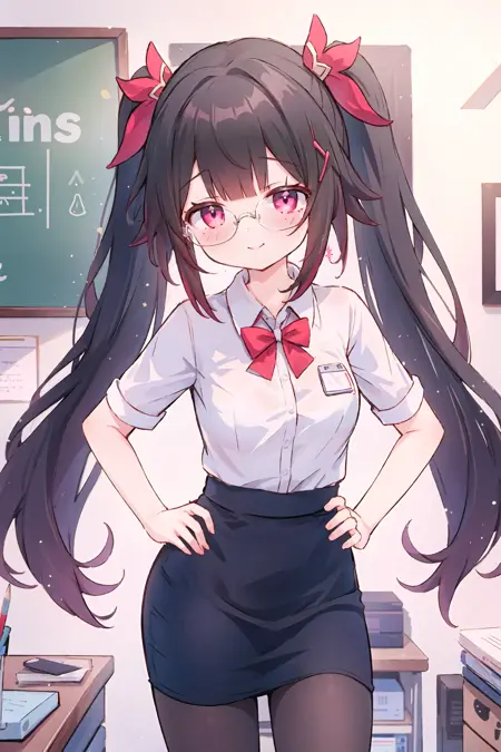 Additional prompts for JK costume: glasses, blue pleated skirt, blue blazer, white collared shirt, hairclip, open jacket, blue bowtie, hair down, white socks, loafers