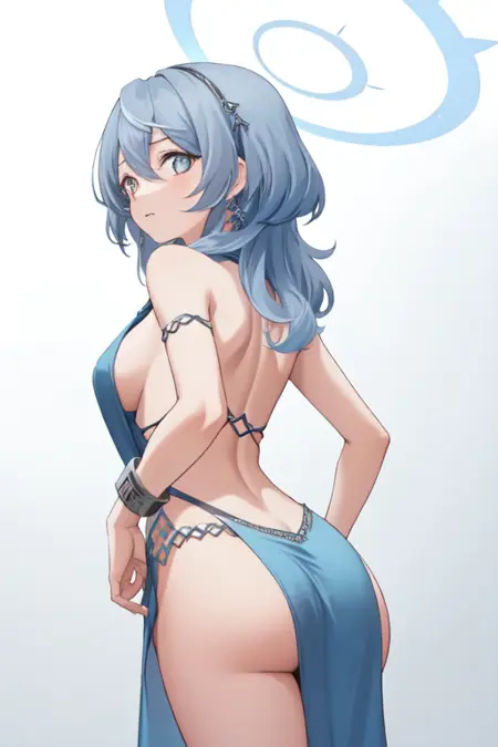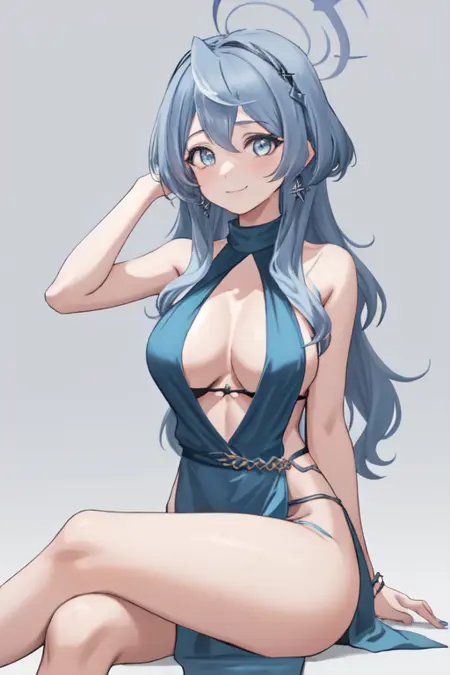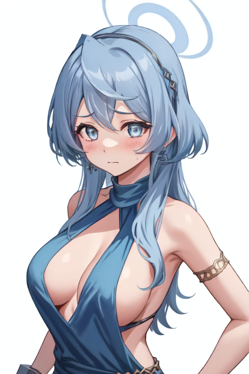 TAG:ako,1girl,solo,halo,blue dress,sideboob,alternate costume,medium hair,cleavage