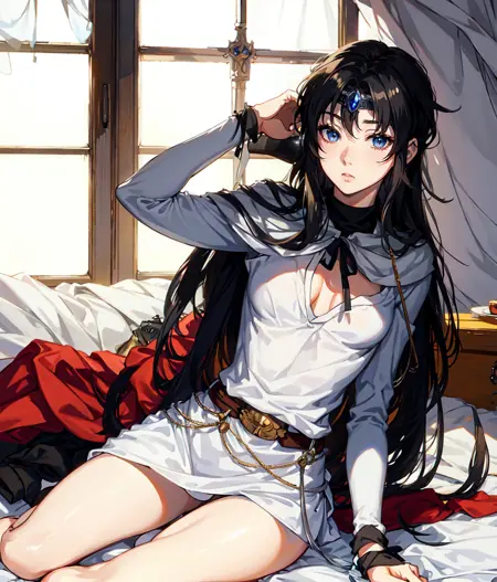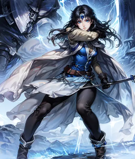 Notable tags: long hair, black hair, blue eyes, silver eyes, circlet, blue vest, pants, cape
