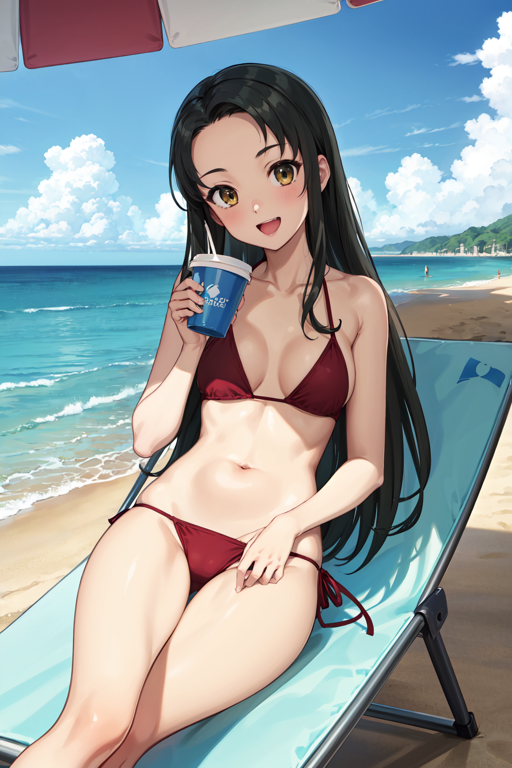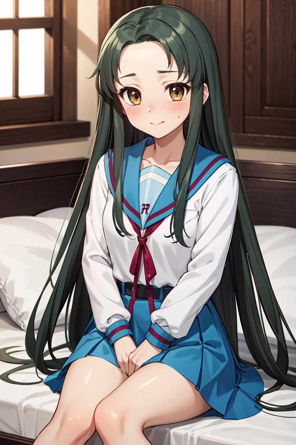 - 鶴谷、長い髪、北高校の制服、セーラー服、青いセーラー襟、赤いリボン、白いシャツ、長袖、青いスカート、靴下、白い靴下、ローファー