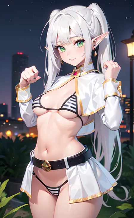 觸發詞: frierenbikiniv1, white skirt, white hair, white capelet, twintails, striped bikini, pointy ears, long sleeves, gold cuffs, jewelry, see-through, midriff, ruby buttons, earrings, belt, bare hands,