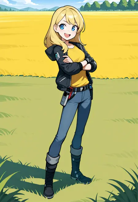来自《队长尼》粉丝重制提案的女主角(在各种概念中名为“Sam”)。提示为“SamN”,服装为“夹克、衬衫、腰带、牛仔裤、靴子”。“单只手套”或“单只机械臂”可能适合她的力量手套,但目前效果不稳定。