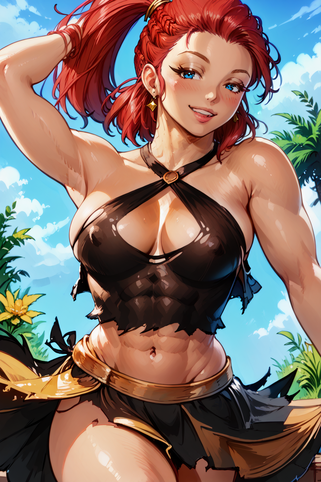 トリガー:1girl、ロングヘア、ポニーテール、ミドルリフ、腕ガード、編み込み、胸板、ベルト、アーマー、片肩甲板、ブーツ、剣所持、盾所持