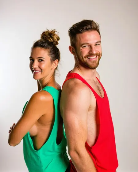 shirt, tank top, tank, sleeveless shirt, (high crewneck:1.3), low-cut chest (males), low-cut cleavage (female), extreme low-cut dropped side holes, side boobs (female), side pecs (males), (male/female) nipple slip, side view, profile, front view, full body medium shot, long shirt, loose shirt, muscle body, thin body