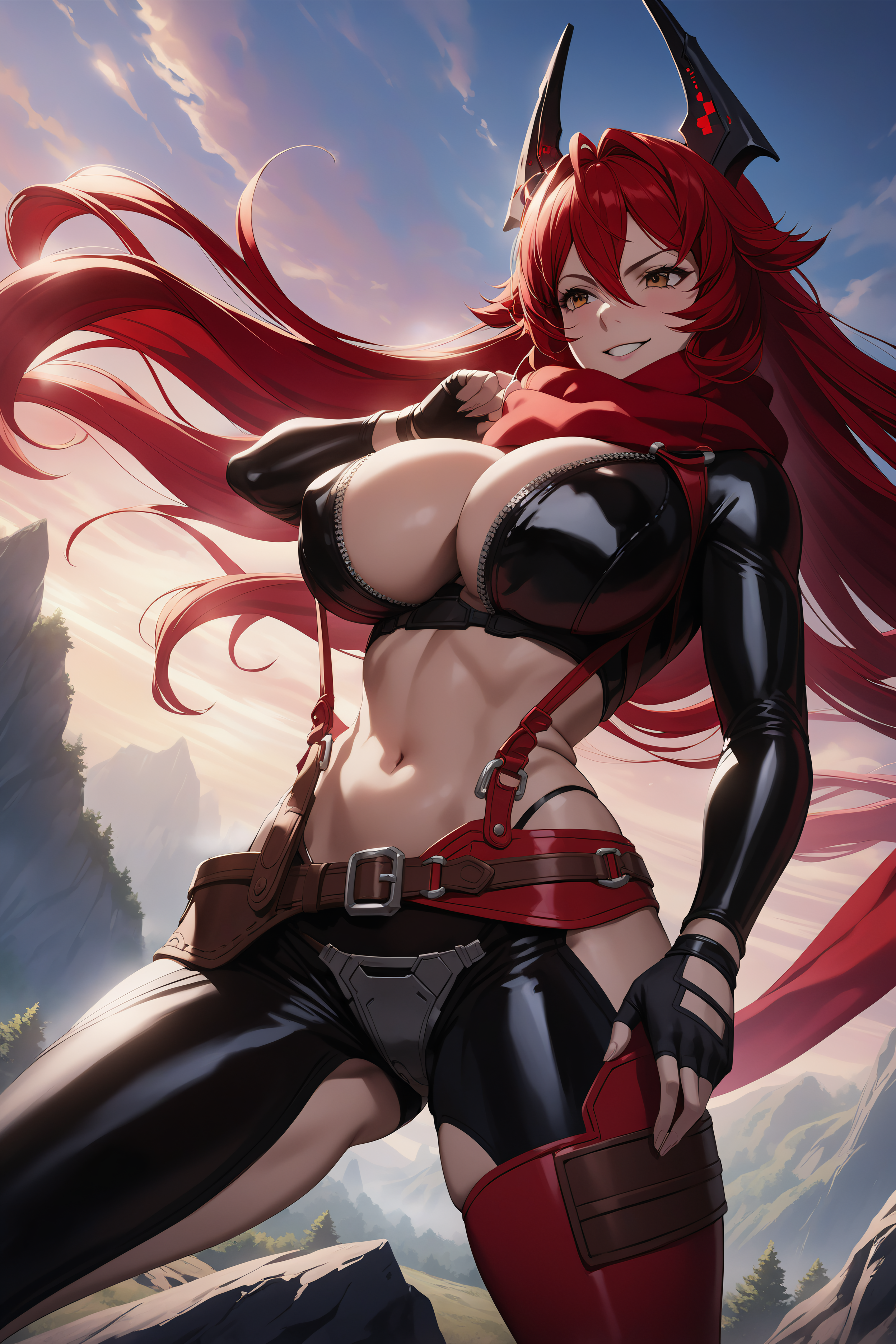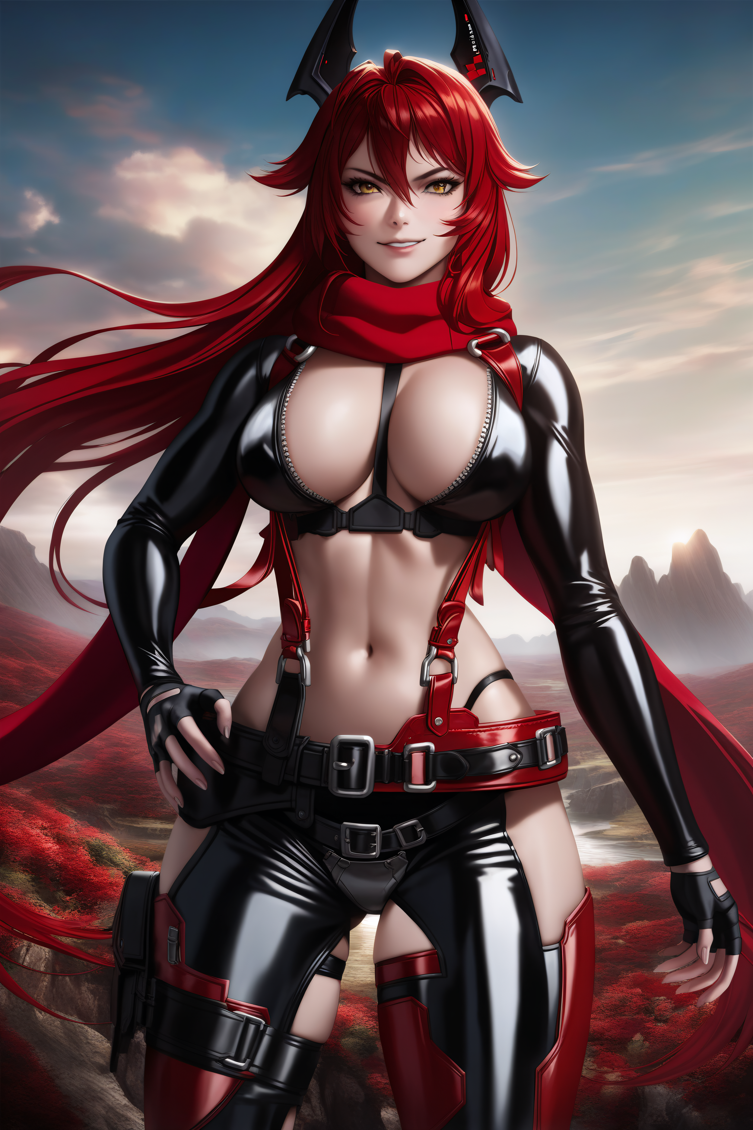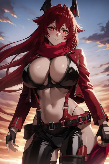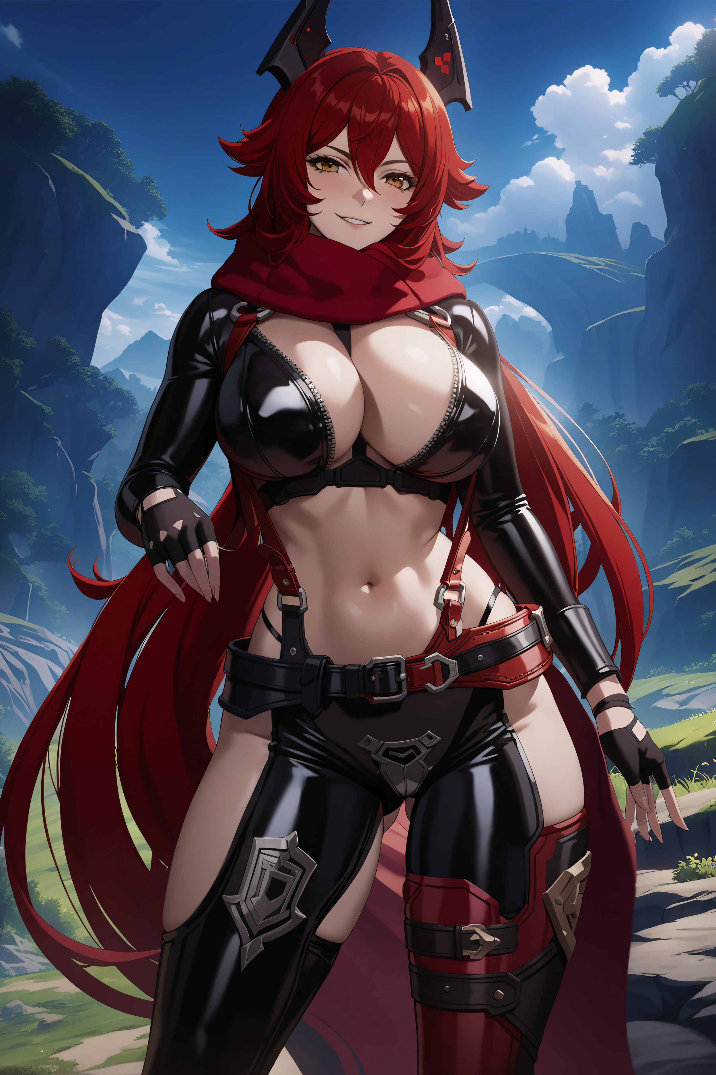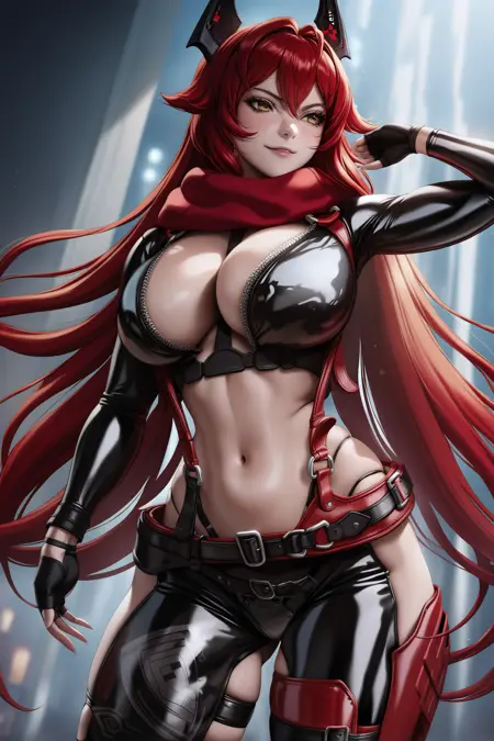 Outfit - red jacket, cropped jacket, red scarf, unzipped bodysuit, suspenders, black pants, belt, fingerless gloves, asymmetrical legwear, hip vent, midriff, high heel boots