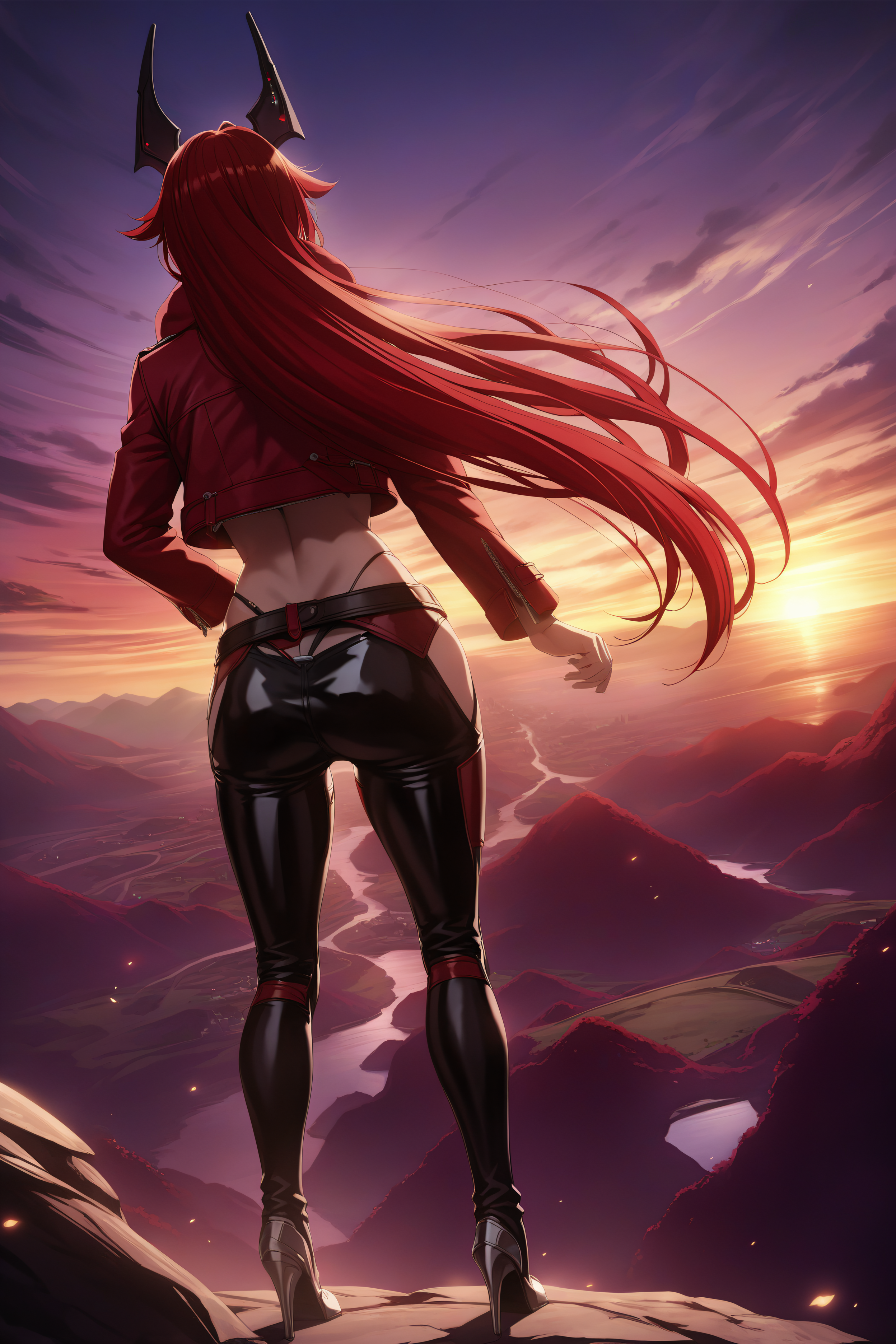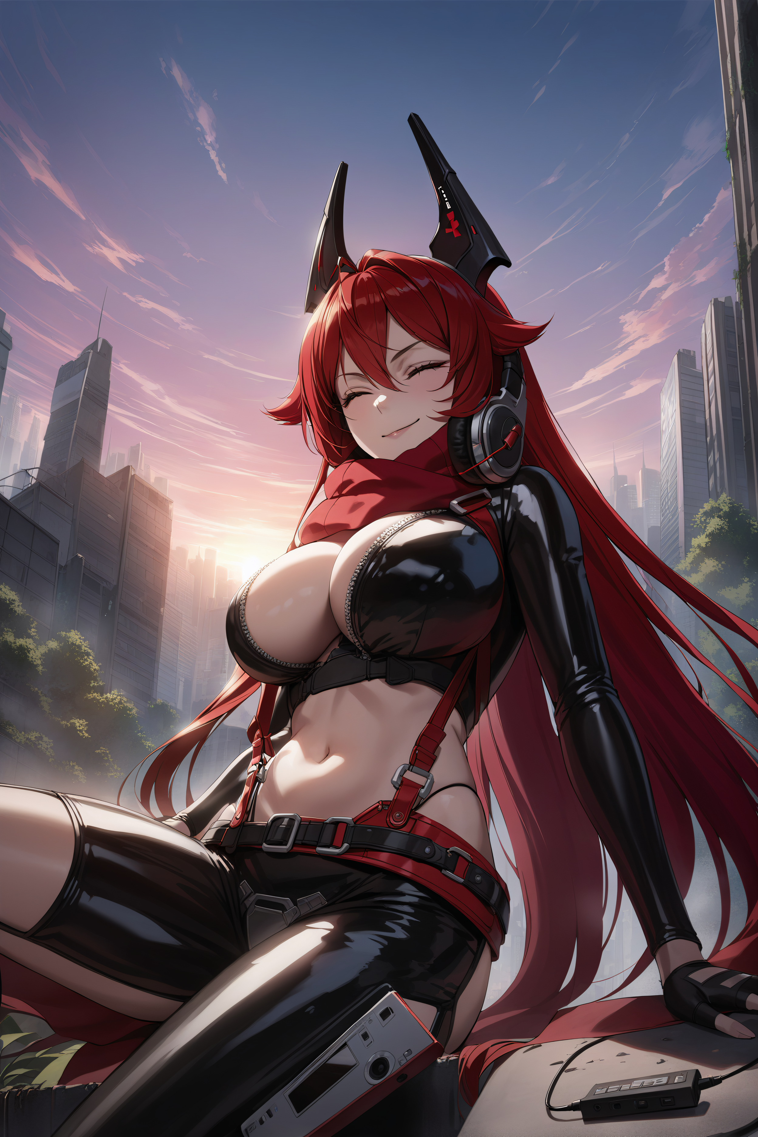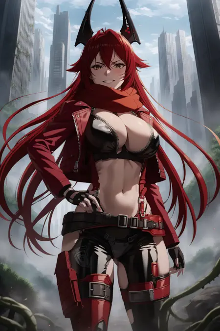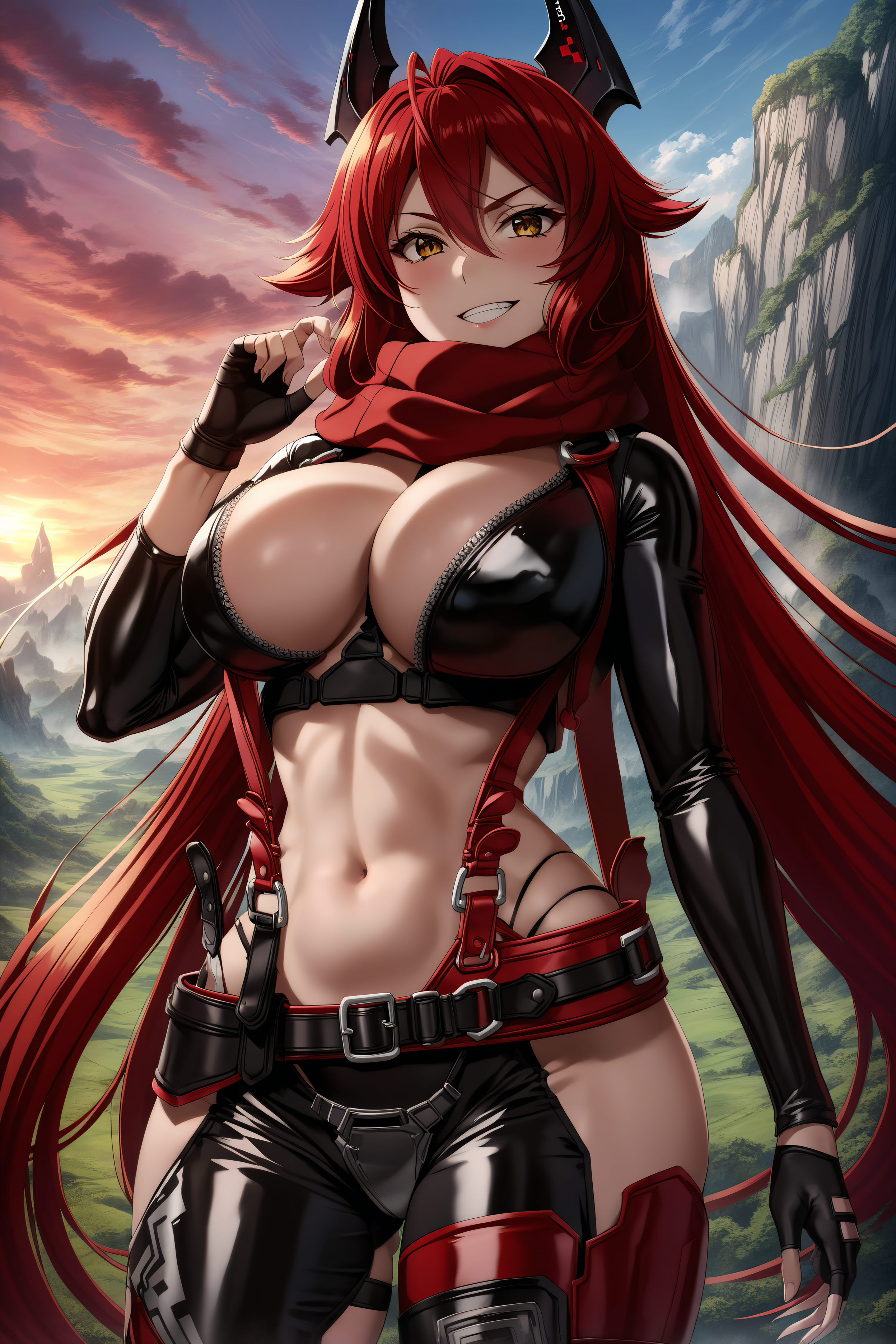 Outfit - red jacket, cropped jacket, red scarf, unzipped bodysuit, suspenders, black pants, belt, fingerless gloves, asymmetrical legwear, hip vent, midriff, high heel boots