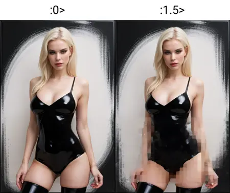 本模型用于添加或移除马赛克效果,同时附带清晰度和模糊效果。负权重增强清晰度,正权重导致模糊。过高的正或负权重可能导致生成图像的构图发生显著变化。