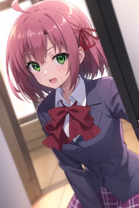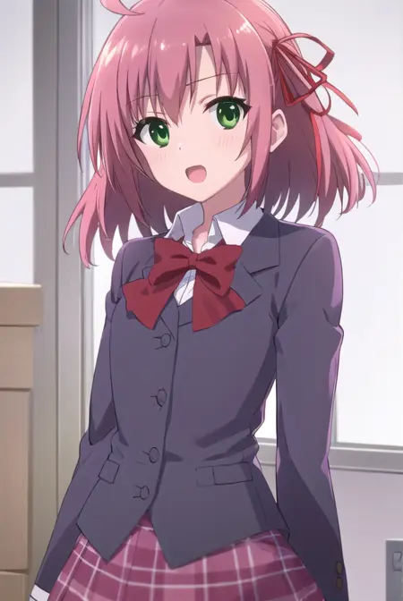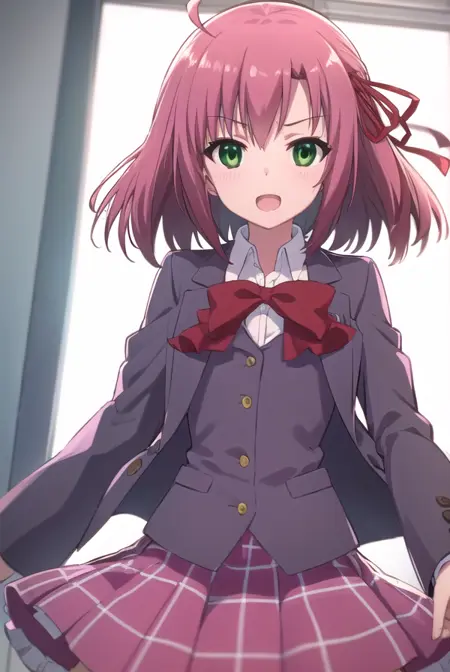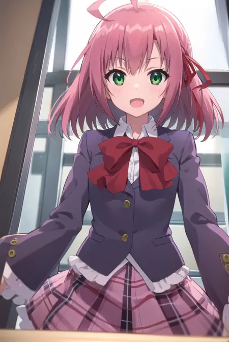 kurimu sakurano, short hair, ribbon, (green eyes:1.3), hair ribbon, pink hair, ahoge,