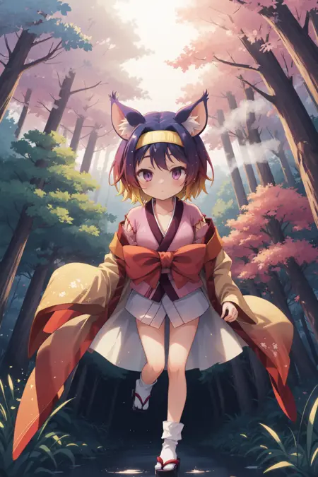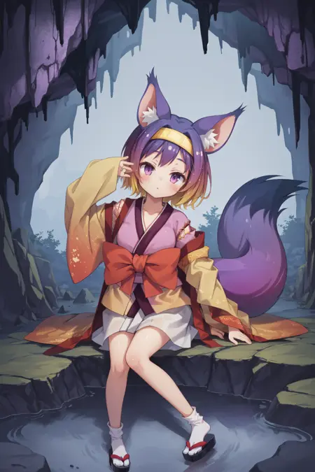 short hair, wide sleeves, sarashi, yellow hairband, tabi, short kimono, gradient hair, 1girl