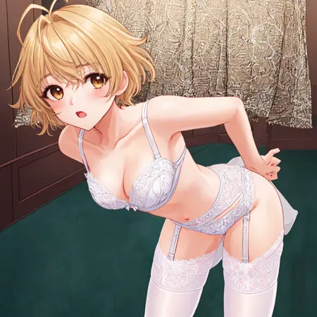 sayaka_kurihara,maid,pantyhose, white pantyhose, petticoat, long sleeves, hat, apron, short hair, dress,blonde_hair,brown_eye,antenna hair, lingerie,lace-trimmed legwear, garter belt,lace trim,long_skirt,