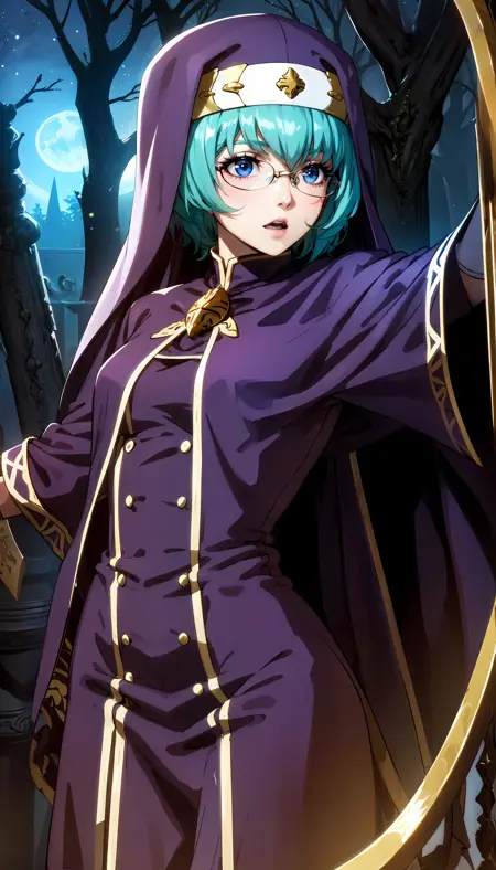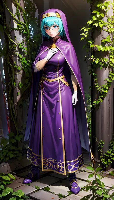 short hair, cyan hair, blue eyes, glasses, purple robe, purple headdress, white lining, white gloves, gold headband