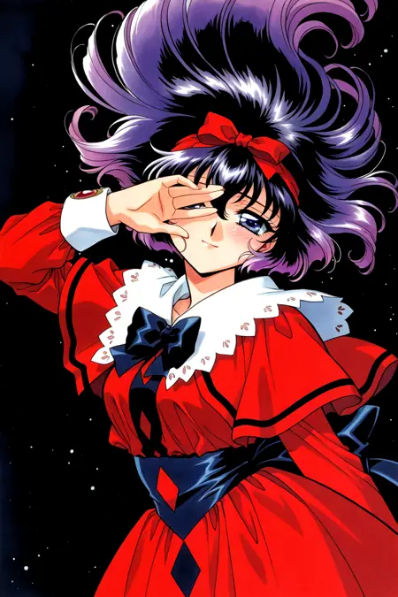 Hikaru: _red eyes, red hair, single braid, hair between eyes (_or bangs)