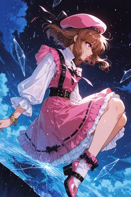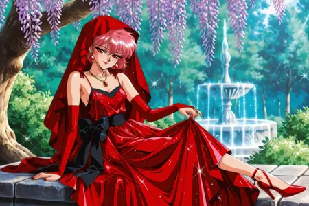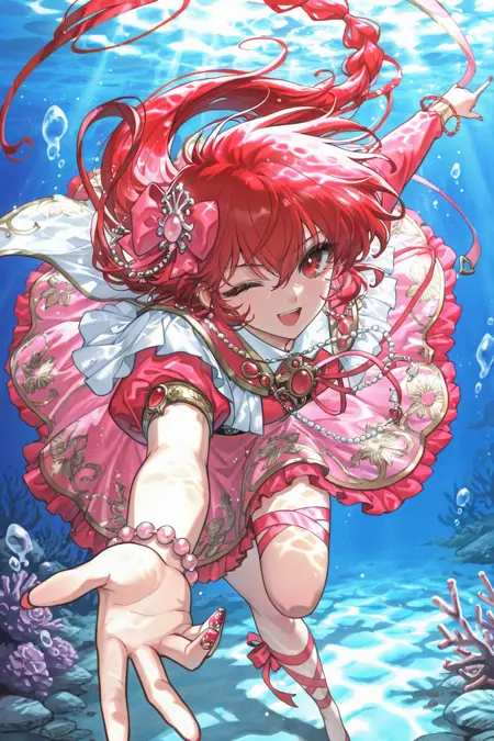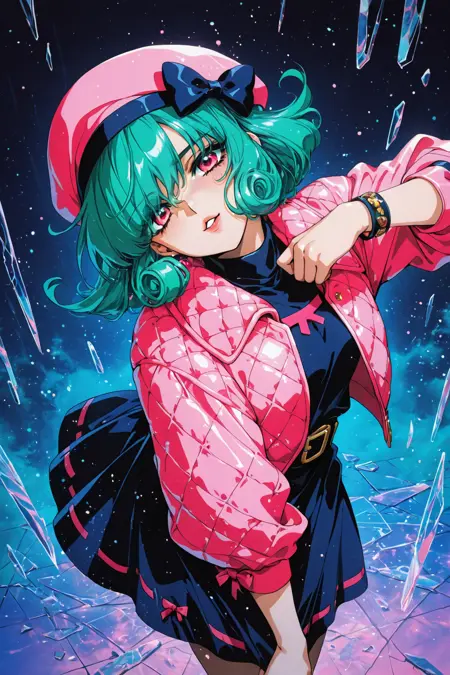 Nova: red eyes, pink hair, long hair, sidelocks, messy hair