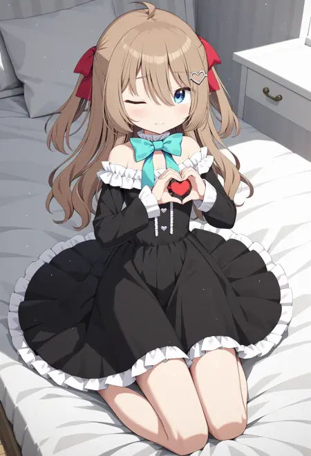 light brown hair, ahoge, two side up, hair ribbon, dark red ribbon, heart hair ornament,