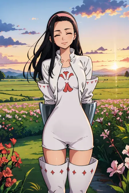 Add "hairband, cropped jacket, white jacket, white dress, short dress, gauntlets, thigh boots" for her regular appearance.