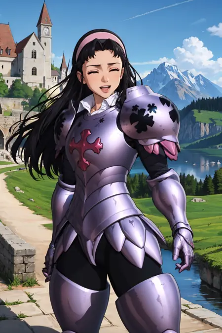 Add "hairband, full armor, shoulder armor, armored boots" for her armor.