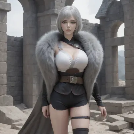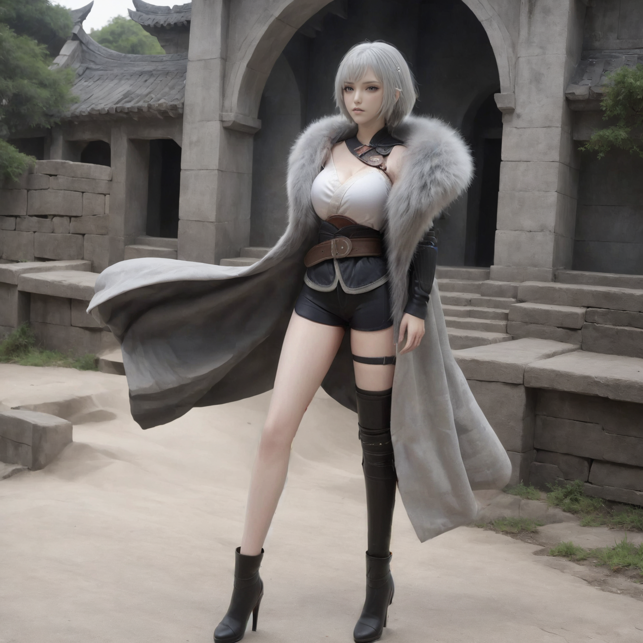 gray fur cape,single thighhigh,asymmetrical legwear,black shorts,boots,black footwear,belt,high heels,thigh strap