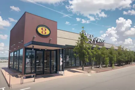 Prompt: hachibanramen, storefront, scenery, outdoors, sky, sign, blue sky, power lines, day, building, utility pole, tree, shadow