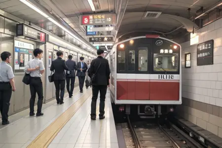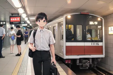 Prompt: OsakaMetro10A, subway station, train station, train, multiple boys, 6+boys, scenery, real world location, blurry, bag, railroad tracks, brown hair, night, outdoors