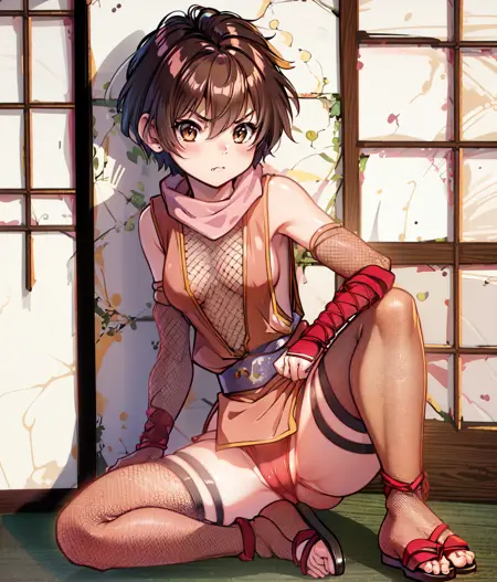 Notable tags: brown hair, brown eyes, pink outfit, japanese gauntlets, fishnet