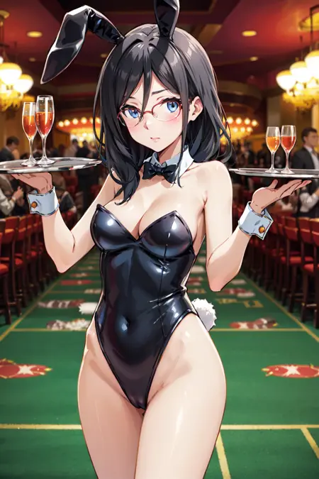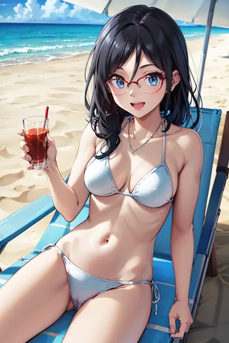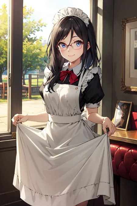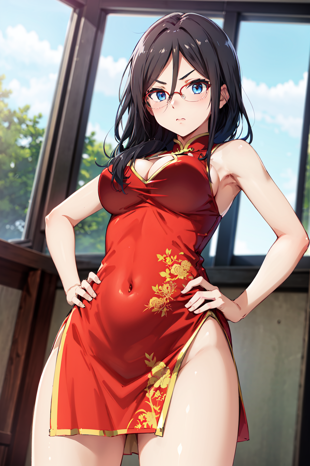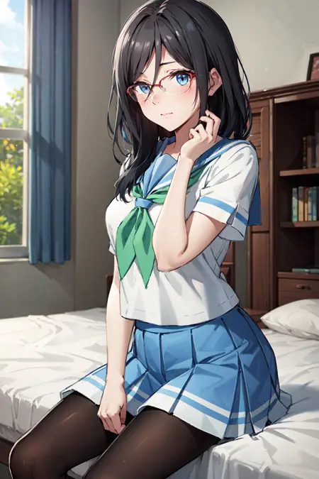 - bbasuka,long hair,glasses,red-framed eyewear,kitauji high school uniform,serafuku,sailor collar,blue sailor collar,neckerchief,green neckerchief,shirt,short sleeves,skirt,blue skirt,pantyhose,black pantyhose,uwabaki