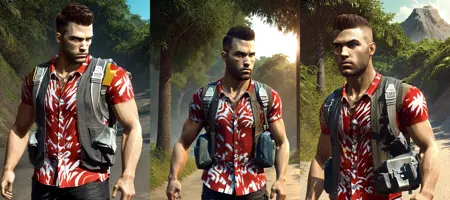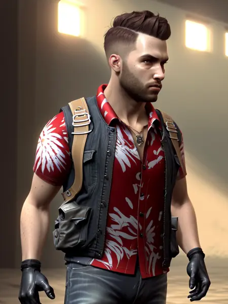 jack carver far cry, 1boy, male focus, solo, pale skin, manly, black hair, short hair, gloves, fingerless gloves, shirt, facial hair, red hawaii shirt, hawaii shirt, pants, brown pants, belt, print shirt, realistic