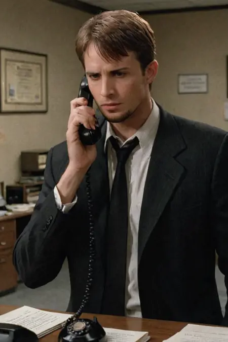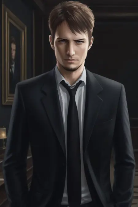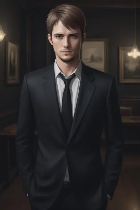 General tag structure for this version: kyle_hyde, <<type of image: pencil drawing / pencil sketch>>, <<optional: drawing in thick lines, monochrome / grayscale>>, 1man, <<face portrait / upper body / full body>>, <<perspective (optional): side view>>, <<actions: looking at viewer / smiling / thinking / holding phone / closed eyes / holding gun / sitting on couch / holding and reading book>>, <<clothes: formal black suit / blue jacket, white collared shirt, black necktie>>, <<expression: frown / serious face / surprised expression>>, hands in pockets, <<background: white background / dark city street / indoor background / blurry background of desert>>