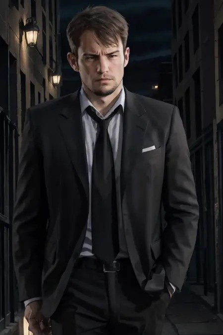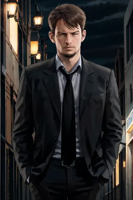 General tag structure for this version: kyle_hyde, <<type of image: pencil drawing / pencil sketch>>, <<optional: drawing in thick lines, monochrome / grayscale>>, 1man, <<face portrait / upper body / full body>>, <<perspective (optional): side view>>, <<actions: looking at viewer / smiling / thinking / holding phone / closed eyes / holding gun / sitting on couch / holding and reading book>>, <<clothes: formal black suit / blue jacket, white collared shirt, black necktie>>, <<expression: frown / serious face / surprised expression>>, hands in pockets, <<background: white background / dark city street / indoor background / blurry background of desert>>