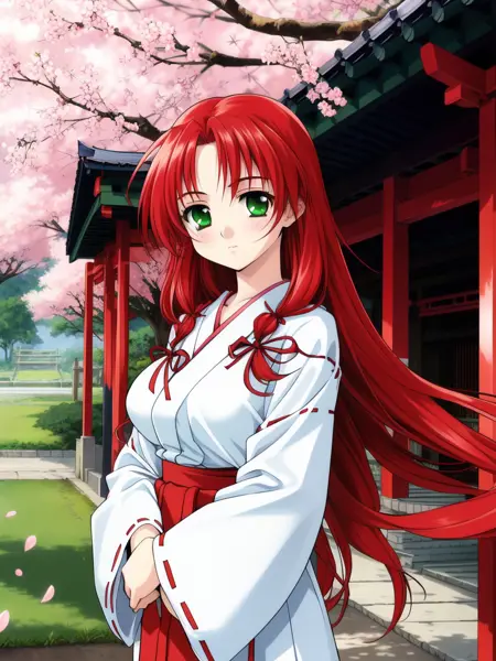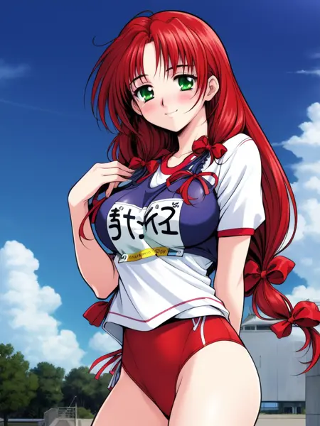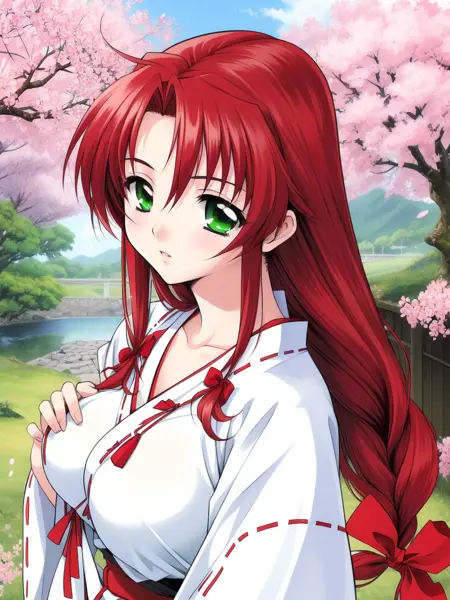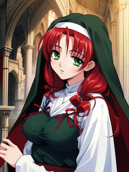 Mew(words_worth), 1girl, solo, green eyes, red hair, long hair, ribbon, hair ribbon, breasts,