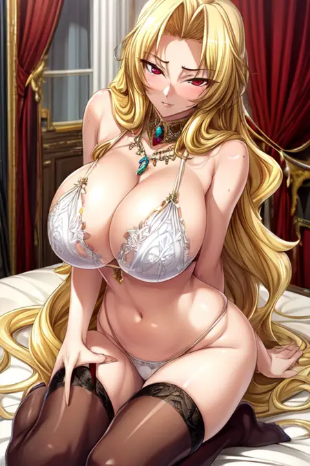 아리시아 뷰스트레움, 1girl, 성숙한 여성, 금발, 긴 머리, 붉은 눈, 거대한 가슴, 빨간 립스틱, 곡선적인 몸매