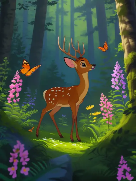 master piece, high quality, A deer in the forest, Disney style, animated film, cartoon