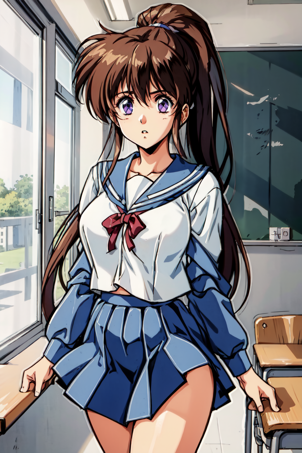 Character appearance word : long hair, purple eyes,Hair color Light brown,Hair length Long ponytail,