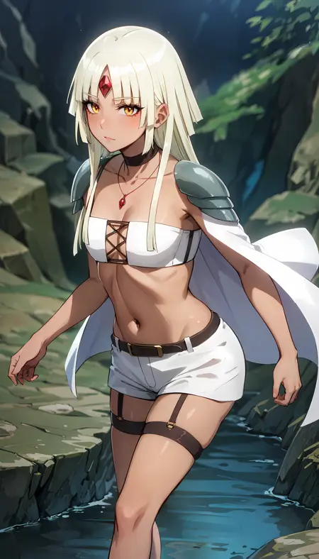 tanned skin, long hair, blonde hair, yellow eyes, white top, white shorts, white cape, white gloves, shoulder pads, choker, necklace, red gem on forehead, black belt, leather leg harness