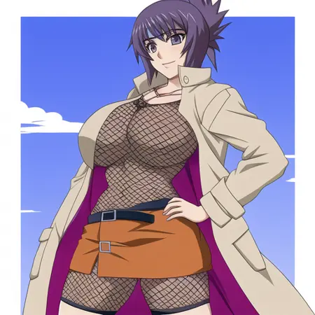 <lora:Mitarashi_AnkoV2:0.7> mitarashi_anko, forehead_protector, Anko_fishnet_bodysuit_bare_legs_Brown_microskirt_Brown_open_trench_coat