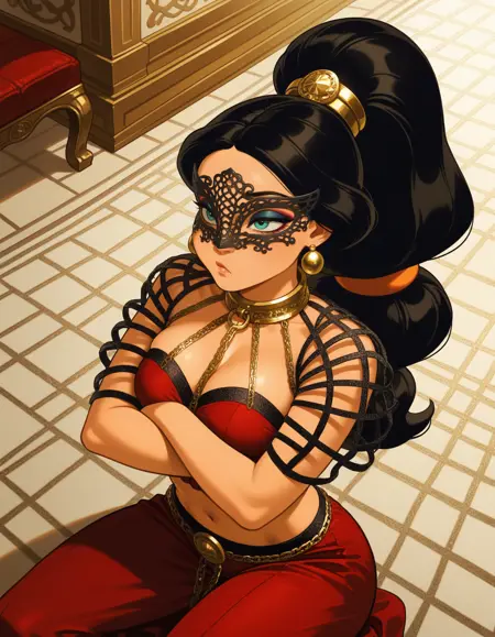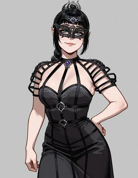 invoke with dr3ss, dress, masquerade mask, choker, harness, (mesh sleeves)