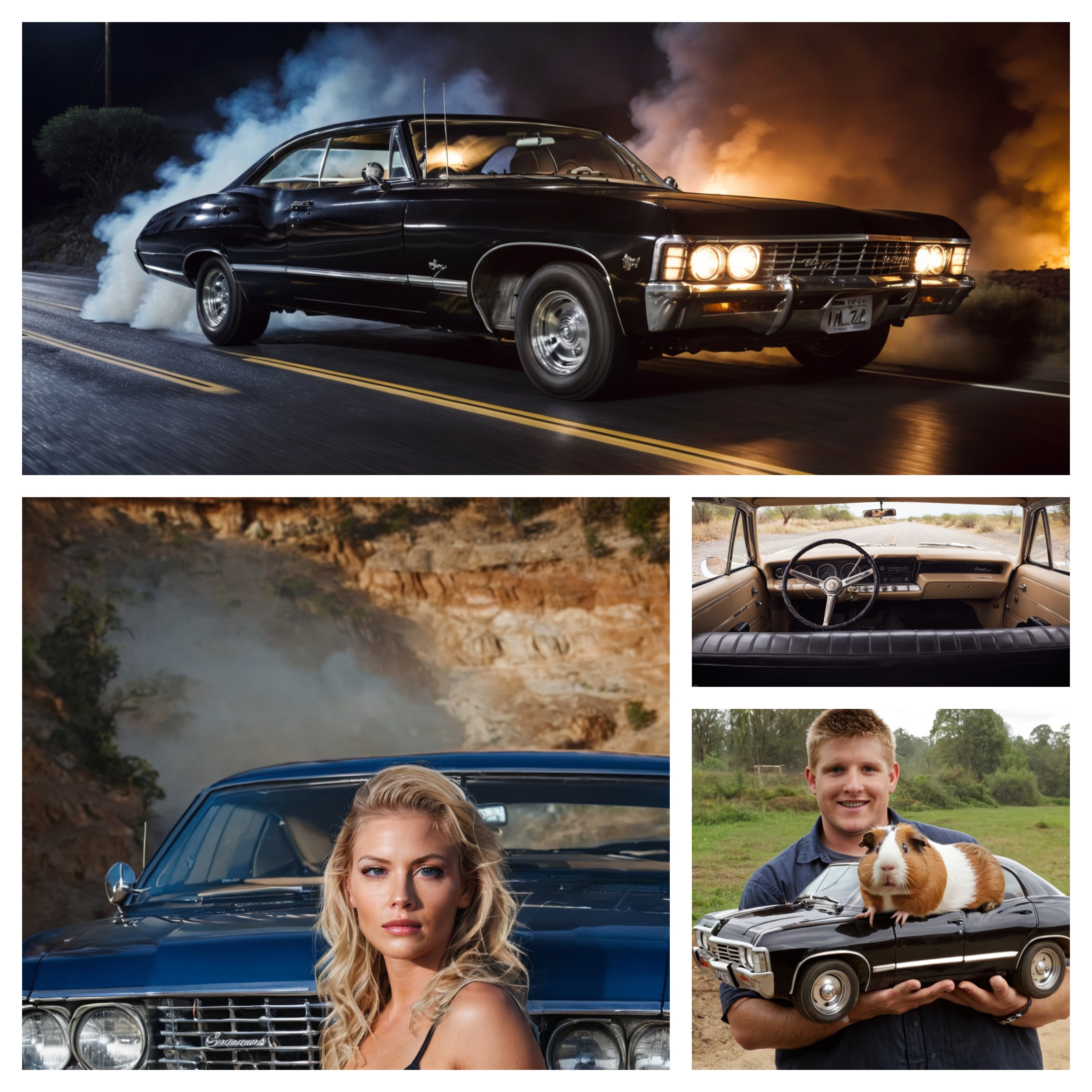 이 LORA는 임팔라의 외부와 내부 모두에서 학습되었습니다. 임팔라 내부에서 영화 같은 촬영이 가능해집니다. 이는 제가 평생 가장 좋아하는 TV 프로그램인 '슈퍼내추럴'에서 영감을 받았습니다. 모델은 여전히 몇 가지 결함이 있습니다. 예를 들어 실내 촬영 시 스티어링 휠이 빠지거나, 차량 안의 사람 위치가 잘못되거나, 대시보드가 차량 뒤쪽에 나타나는 등입니다. 그러나 여전히 매우 멋진 LORA이며, 이러한 문제들은 추후 V2.0 버전에서 수정해보겠습니다.