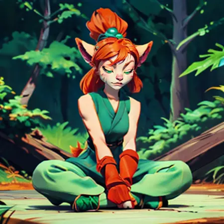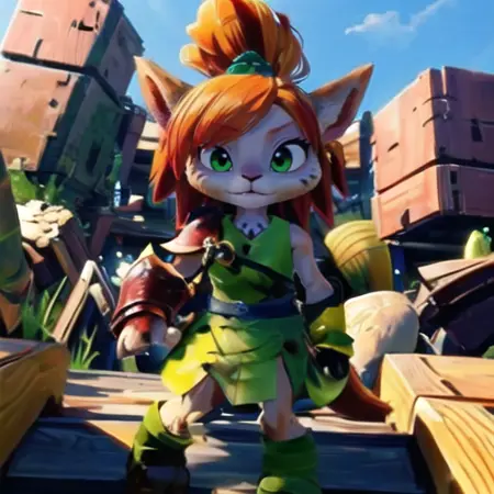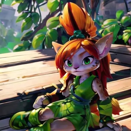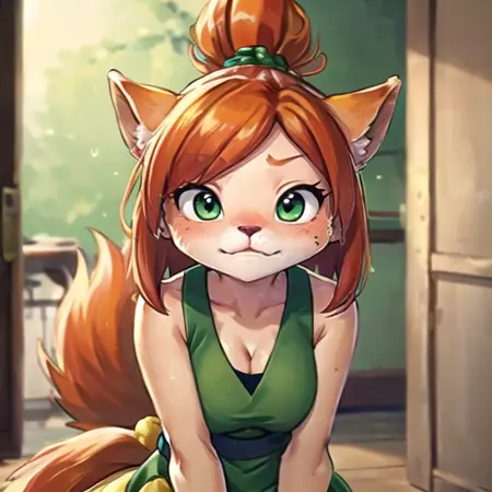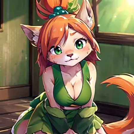 "Tessa, furry, furry female, 1girl, animal tail, animal ears, animal nose, green eyes, Adult, orange hair, pony tail, body fur, sleeveless, green footwear, topknot, green leaf dress"