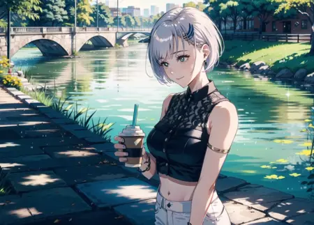 reine-second-outfit, black collared shirt, crop top, white pants, midriff, bare shoulders