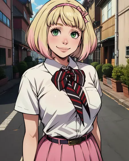 pink hairband, stripped neck ribbon, white shirt, belt ,pink skirt,