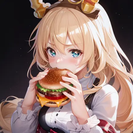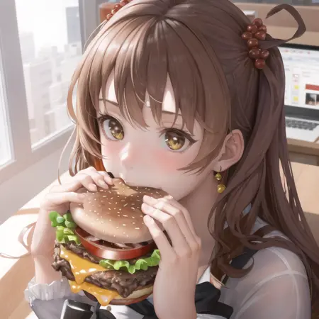 両手で大きなハンバーガーを食べる女の子の画像生成を強化。NovelAIで訓練済み。
