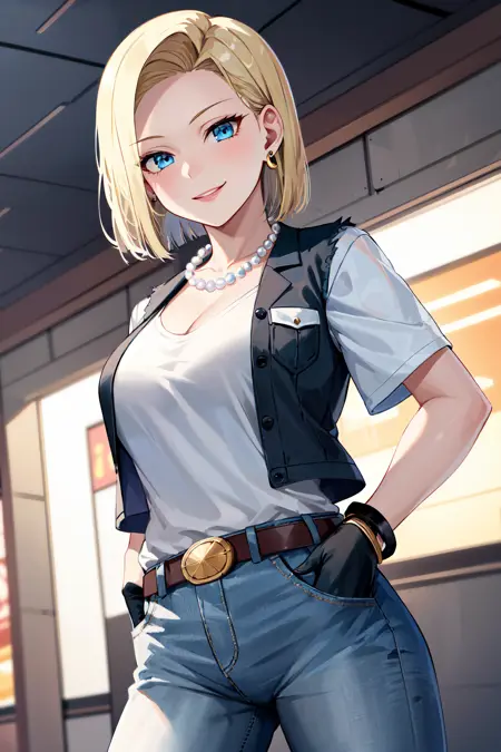 and18, 1girl, android 18, solo, 금발, 파란 눈, 벨트, 청바지, 진주 목걸이, 팔찌, 검은 장갑, 흰색 셔츠, 짧은 헤어스타일, 짧은 소매, 귀걸이, 파란 바지, 오픈 베스트, 검은 베스트, 큰 가슴