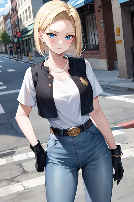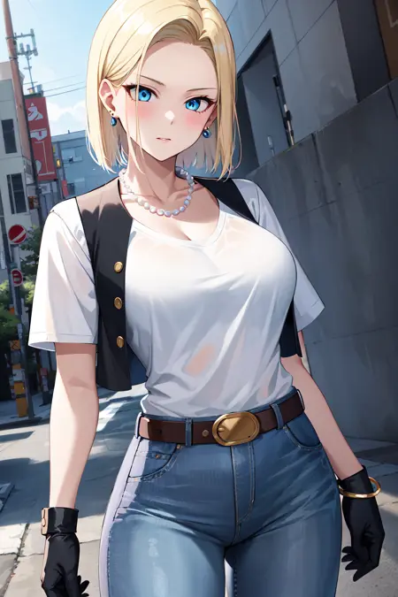 and18, 1girl, android 18, solo, blonde hair, blue eyes, belt, jeans, pearl_necklace, bracelet, black gloves, white shirt, short hair, short sleeves, earrings, blue pants, open vest, black vest, large breasts