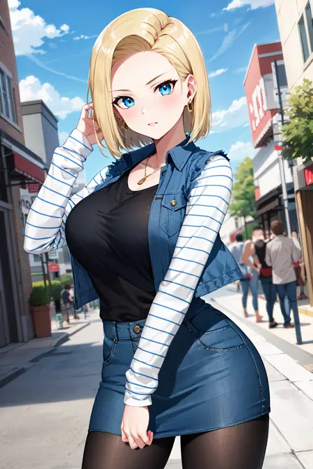 and18, 1girl, android 18, solo, blonde hair, blue eyes, short hair, earrings, jewelry, denim vest, open vest, black pantyhose, black shirt, denim skirt, striped long sleeves, blue skirt, large breasts