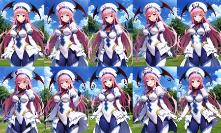 aalala, long hair, hat, white headwear, head wings, green eyes, breasts, red necktie, white bodysuit, white leotard, puffy sleeves, white gloves, showgirl skirt, blue pantyhose