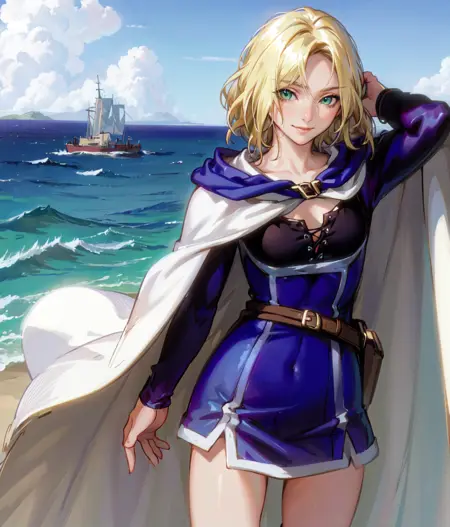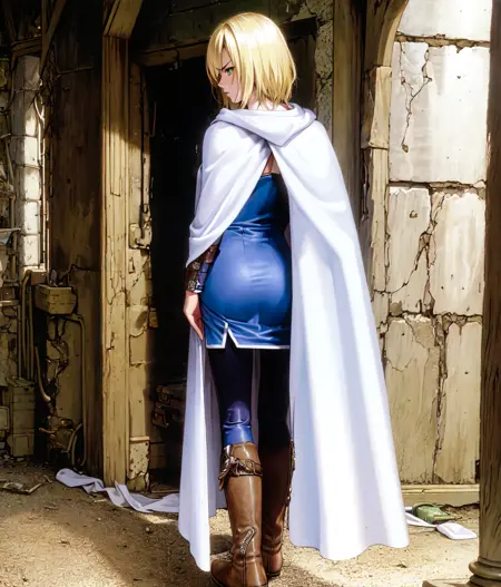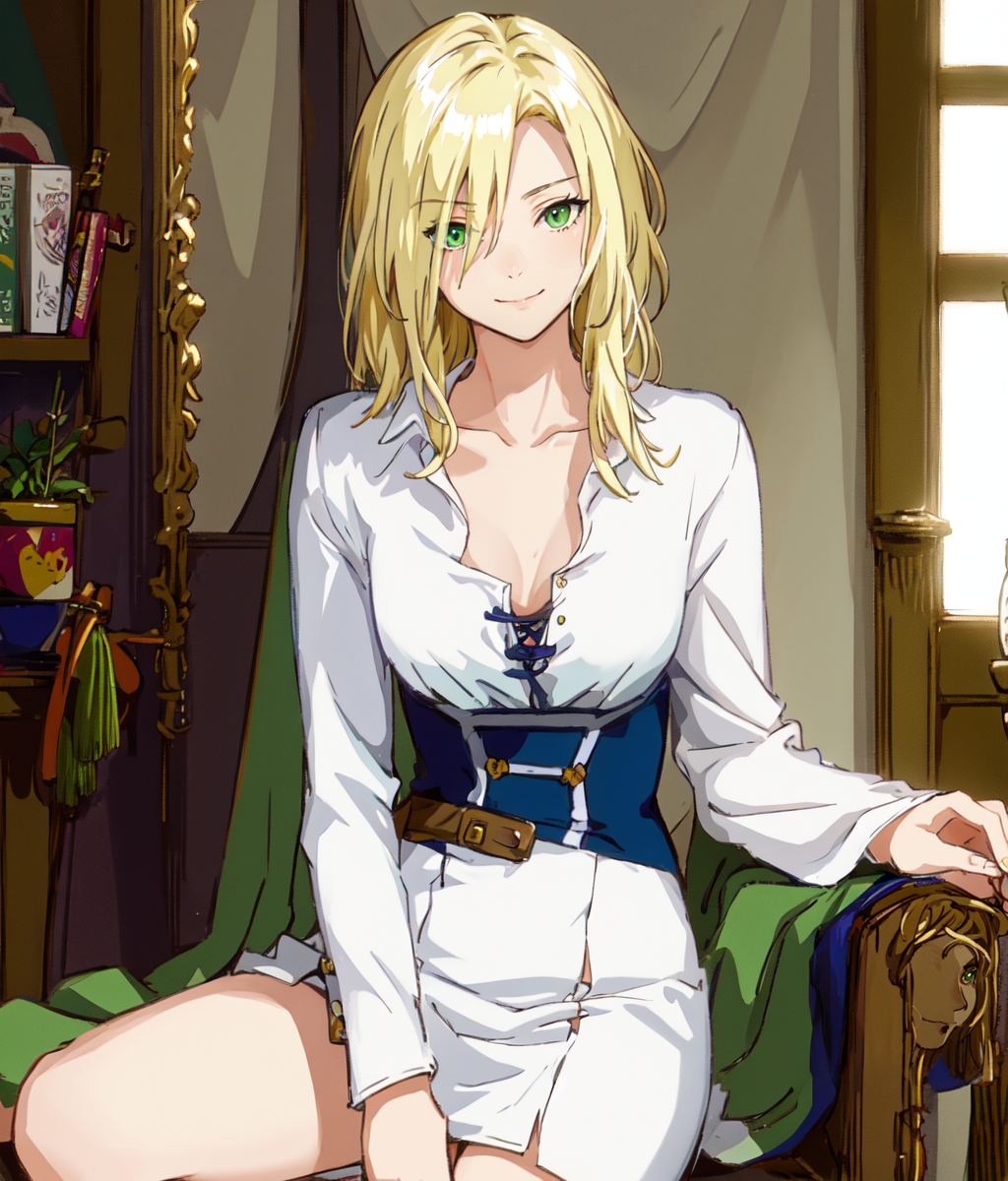 Notable tags: blonde, hair covering one eye, medium hair, green eyes eyes visible under hair, blue dress, black tighs, boots, white cape,