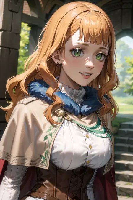 mage_dress, golden_cape, white skirt, red earrings, capelet, fur trim, red cape, brown boots, white sleeves, belt